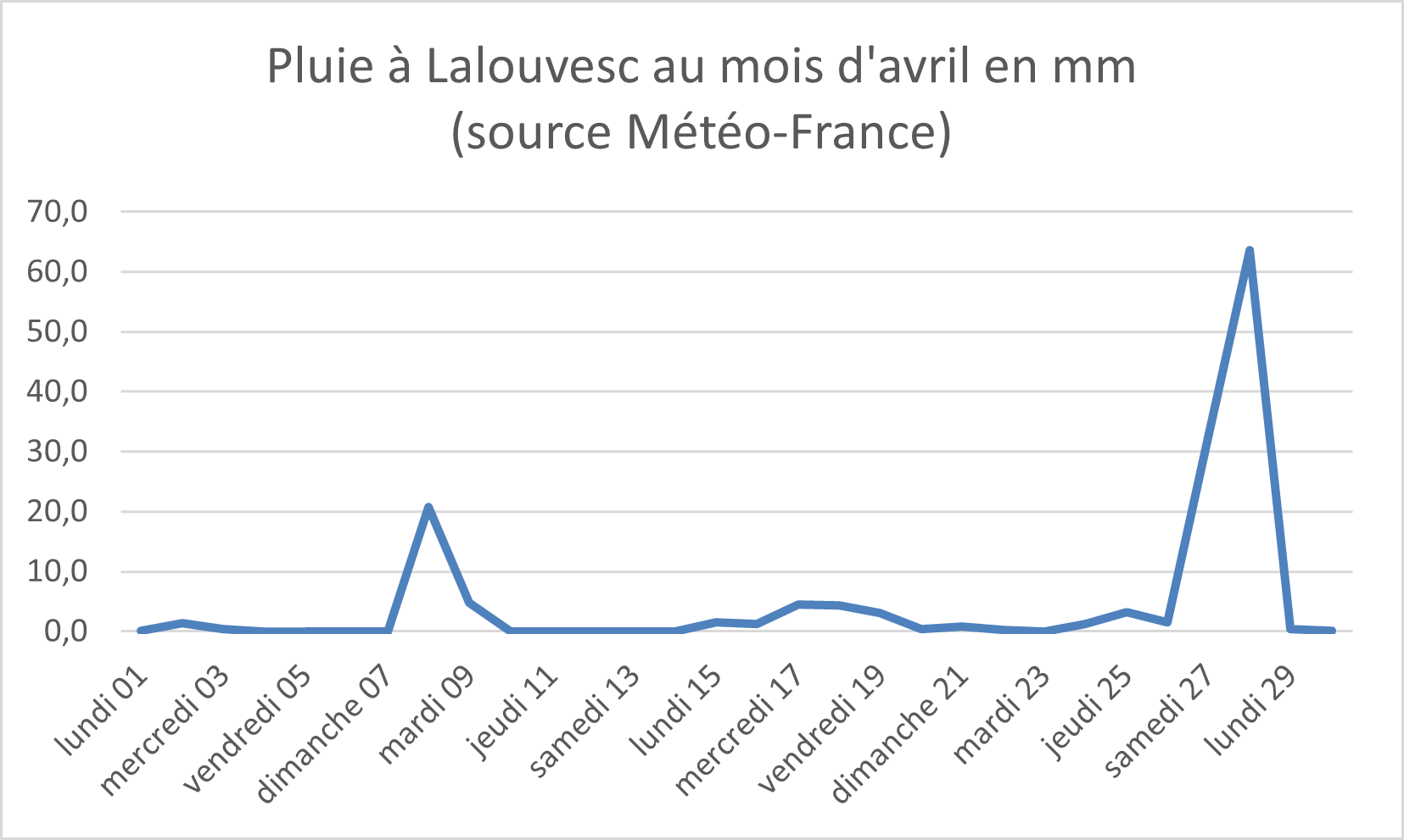 Comme toujours, les pluies se concentrent sur quelques jours du mois comme le montrent les relevés quotidiens du mois d’avril.
