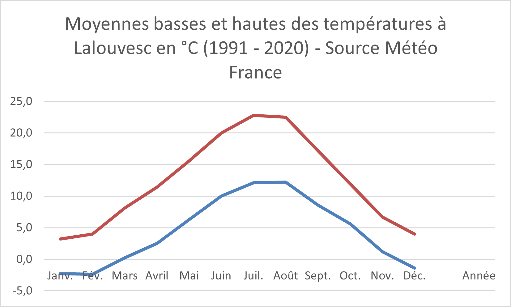 Météo-France nous fournit aussi d’intéressantes indications sur la température. Voici donc, mois par mois la moyenne des températures relevées sur vingt ans (1991-2020) à Lalouvesc. La courbe rouge indique la moyenne des températures maximales constatées, la courbe bleue la moyenne des températures minimales.