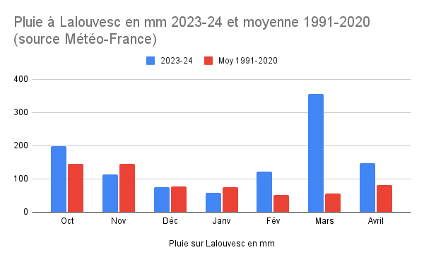 Ainsi si les pluies au début de l’hiver ne se sont pas trop éloignées de la moyenne sur vingt ans, les nuages se sont accumulés à partir de février et surtout en mars et avril. En mars, la pluie a été sept fois plus abondante que la moyenne (356,5mm contre 55,4 en moyenne) !