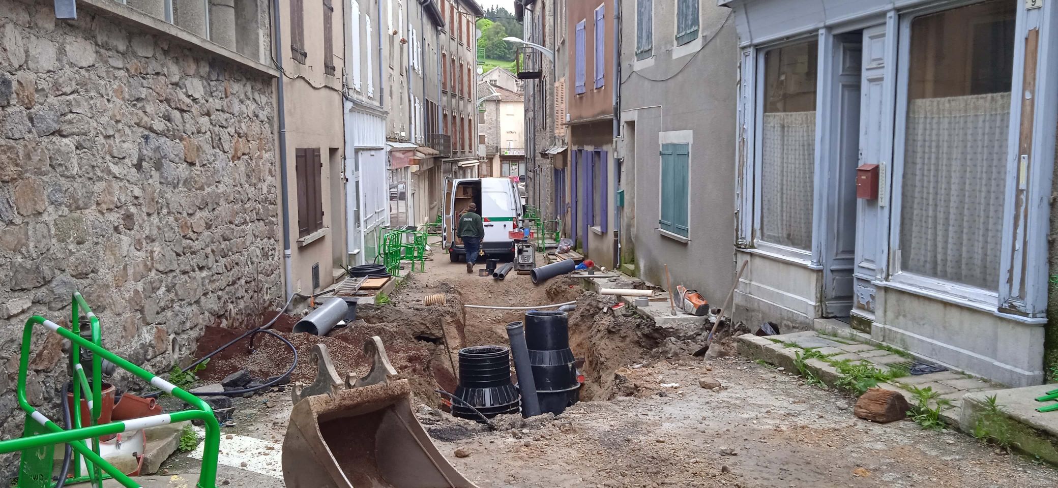 Les travaux de la rue de la Fontaine avancent. La partie basse se terminera avant l’Ardéchoise. L’ensemble sera goudronné.