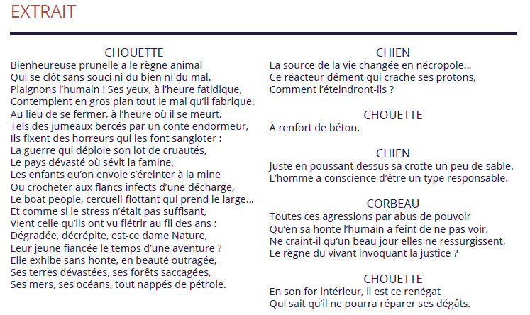 Cette fable lyrique nous propulse au cœur même de la cause verte. Après un nouvel embrasement nucléaire, des animaux s’érigent en tribunal : faut-il acter l’élimination de l’espèce humaine ? Peut-on lui laisser une chance ultime de réparer, comprendre et protéger le vivant ? Malgré l’oppressante gravité du moment, les débats s’enchaînent dans une envolée d’alexandrins, plus émouvants, profonds, facétieux les uns que les autres…