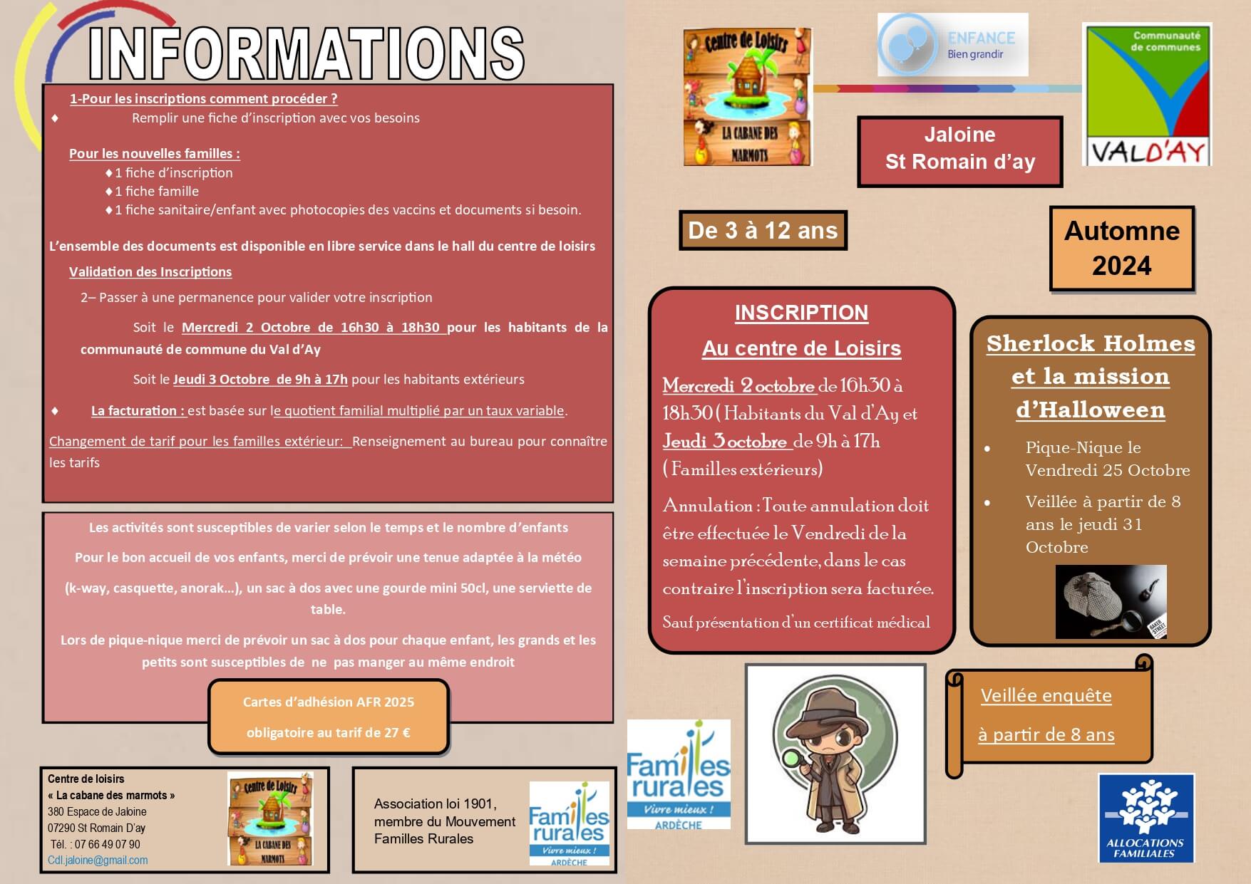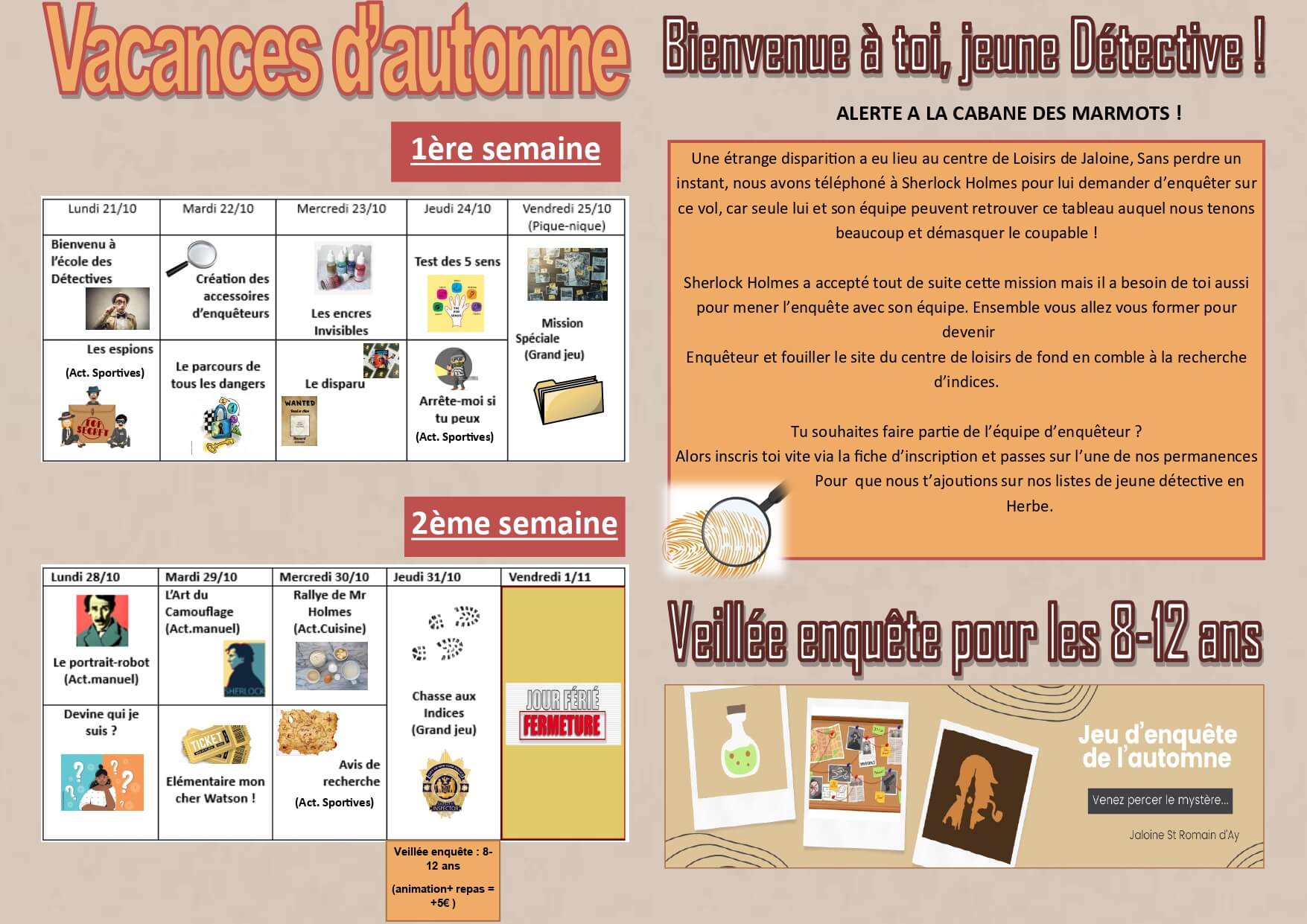 Pour les enfants de 3 à 12 ans du lundi 21 octobre au jeudi 31 octobre 2024, venez mener l’enquête avec Sherlock Holmes. Inscription jusqu’au 3 octobre. Pour plus d’information : 07 66 49 07 90, cdl.jaloine@gmail.com.