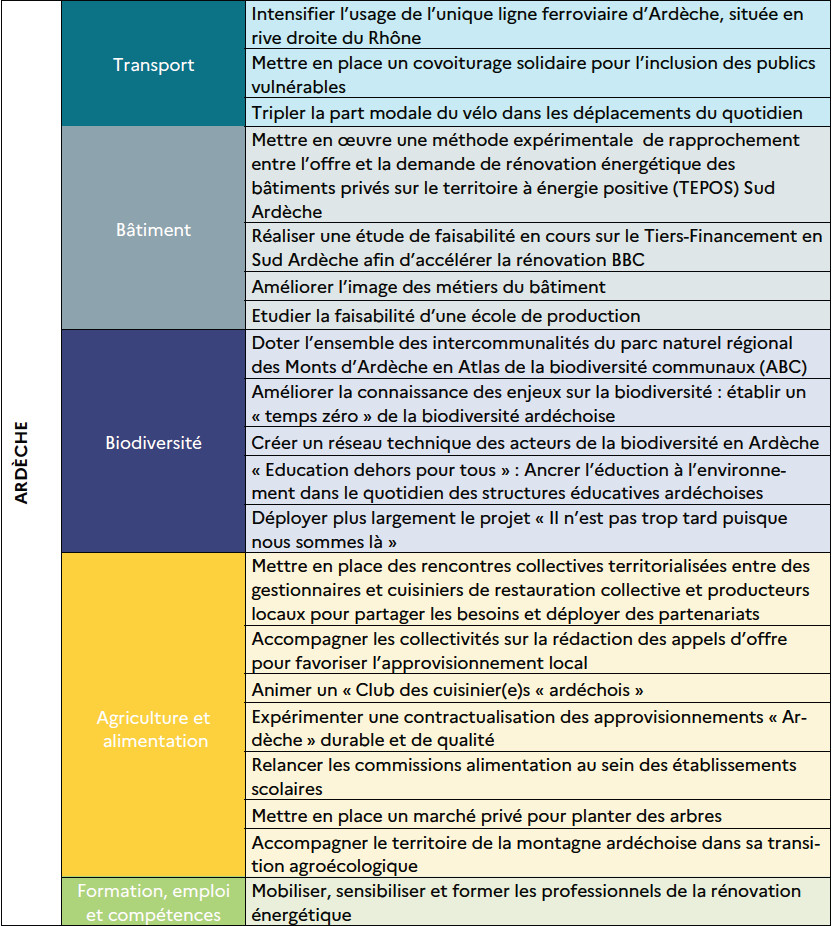 La préfecture de l’Ardèche vient de publier un Cahier départemental de l'Ardèche reprenant les actions privilégiées pour le département issues de la feuille de route régionale de la COP (planification écologique). Des réunions régulières se sont tenues dans l’année et une vingtaine d’actions ont été pointées dans les secteurs du transport, du bâtiment, de la biodiversité, de l’agriculture et l’alimentation et de la formation, emploi et compétence.