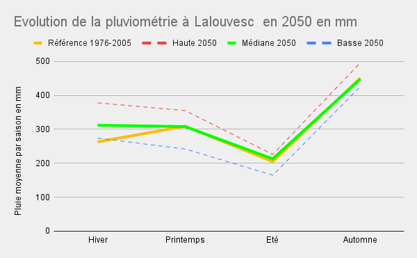On s’aperçoit que la température augmente pour chaque saison d’environ 2°C, ce qui reste très raisonnable pour le village compte tenu de la température de départ. De plus, l’étude montre qu’il n’y aura toujours pas de température égale ou supérieure à 35°C, entre 2 à 6 nuits chaudes (où la température ne descend pas au dessous de 20°C) et 18 jours en vague chaleur contre 3 actuellement. Un jour est considéré en vague de chaleur s’il s’inscrit dans un épisode, se produisant l’été, d’au moins cinq jours consécutifs pour lesquels la température maximale quotidienne excède la normale de plus de cinq degrés.