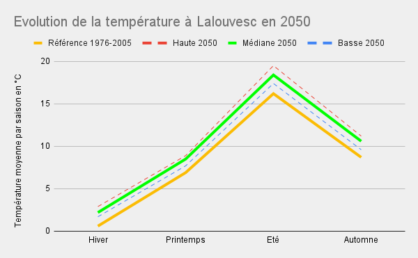 Sur le graphique, la courbe jaune présente la température moyenne du village entre 1976 et 2005, la verte est celle prévue par Météo-France à partir des données du GIEC pour l’année 2050, la bleue et la rouge en pointillés montre l’intervalle de variation possible.