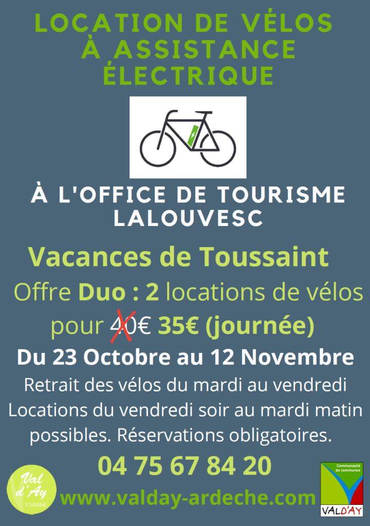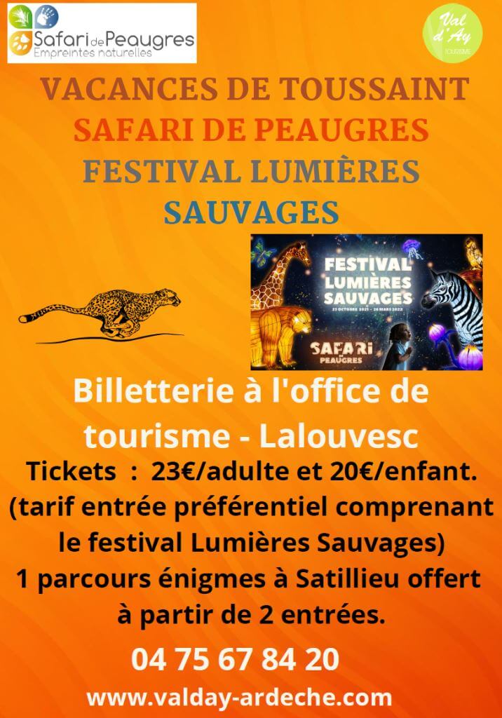 L' office de tourisme propose des offres pour les vacanciers de la Toussaint concernant la location de vélos à assistance électrique mais aussi la vente de tickets pour le Safari de Peaugres, qui à partir du 22 octobre propose avec l’entrée au parc animalier le festival Lumières Sauvages.